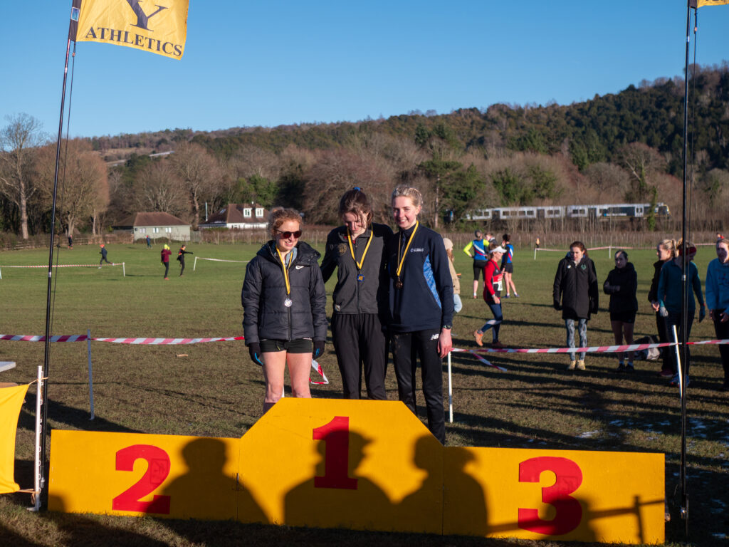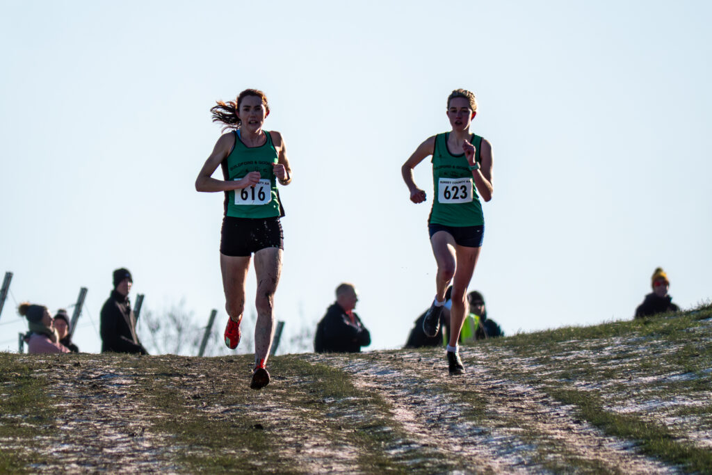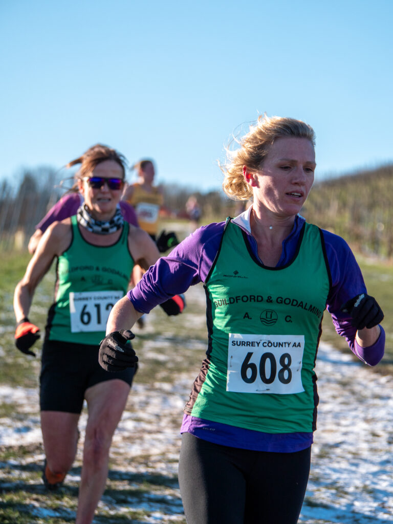 Evie Warren’s superb third place finish led Guildford & Godalming’s senior women to team silver at the Surrey Cross-Country Championships held at a very chilly Denbies Vineyard on Sunday. Evie finished one place in front of her teammate Suzie Monk, who won this race at Croydon last season. Ellie Bull (14th) and Hope Smith (20th) on her debut completed the 4-to-score team competition.